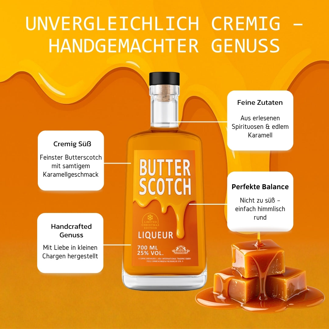 Erlebe die Magie der Feiertage mit der exklusiven V-Sinne Christmas Edition: Butterscotch Likör. Unsere winterliche Spezial-Kreation vereint den zartschmelzenden Geschmack von cremigem Butterscotch, feinem Karamell und einem Hauch Vanille zu einem außergewöhnlich runden und festlichen Likörgenuss.